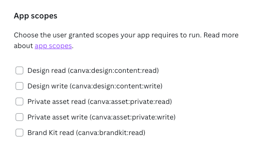 By requiring apps to enable scopes, Canva can inform users of what data the app will have access to — and what the app can do with that data — before the user installs it.