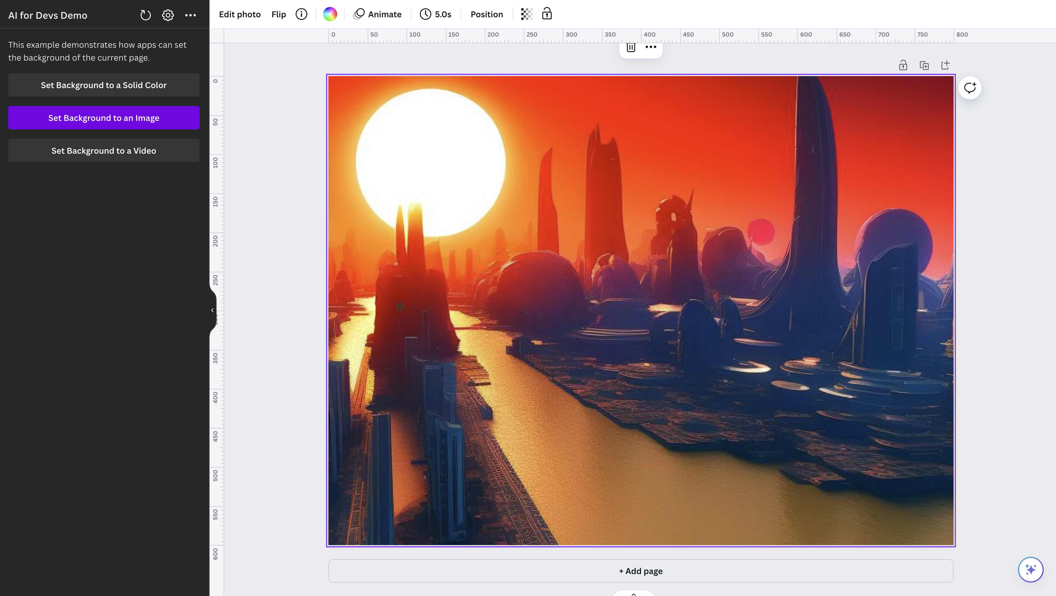 Using the setCurrentPageBackground you can update a design’s background. Based on which page a user has selected, that will set the context for the Current Page. This is useful if you're generating scenes or low fidelity imagery that aren’t the focal point of the design. Once the new image is generated, you can upload it and add it as the background.