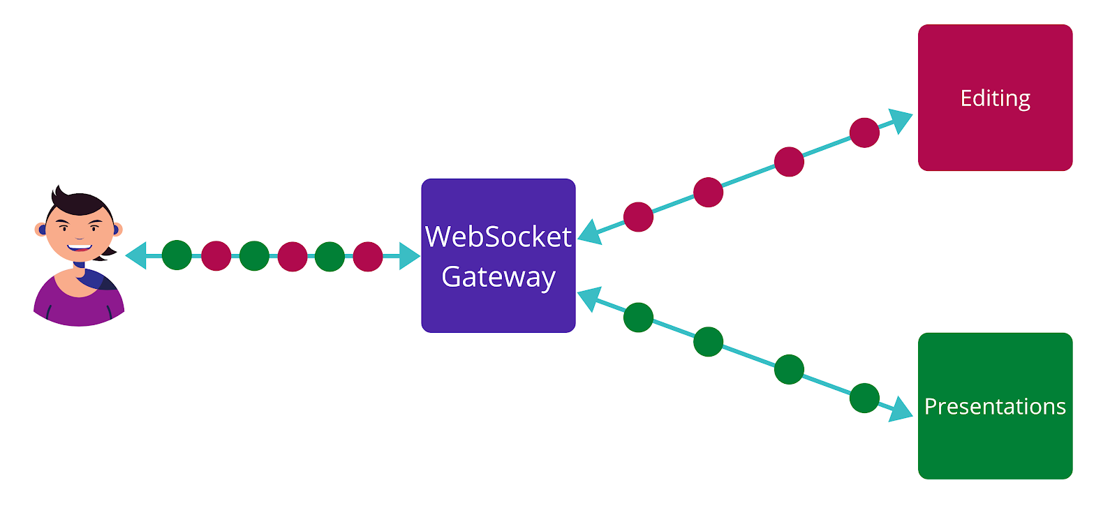 Multiplexing (and demultiplexing) is the most important role of the WebSocket Gateway as it accepts the connections from the users, reads the incoming messages, and forwards them into channels connected to different backends like in the figure below. The red messages flow to the editing backend, while green messages flow to the presentations backend even though the client sends all messages into the same connection.