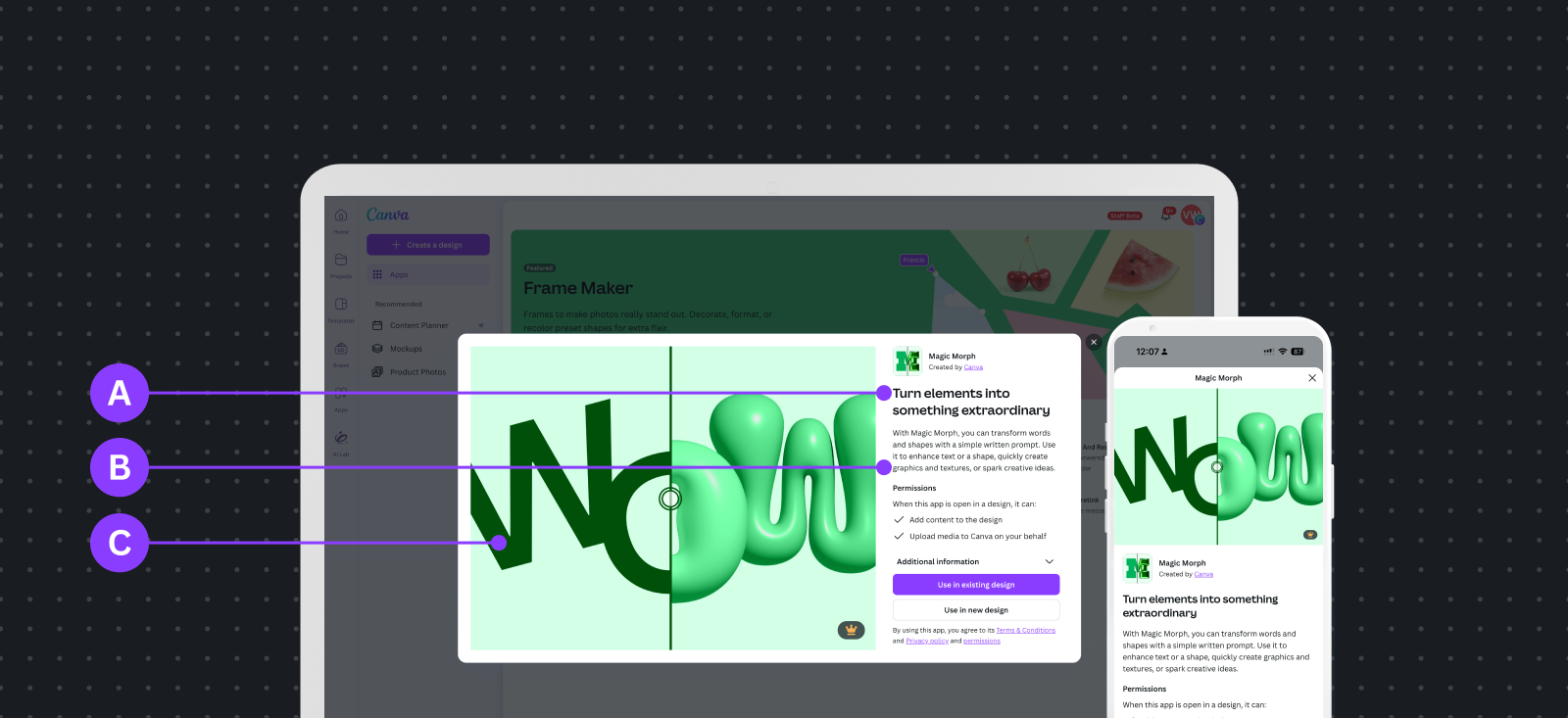 The app listing is seen in various places in Canva and the Apps Marketplace.